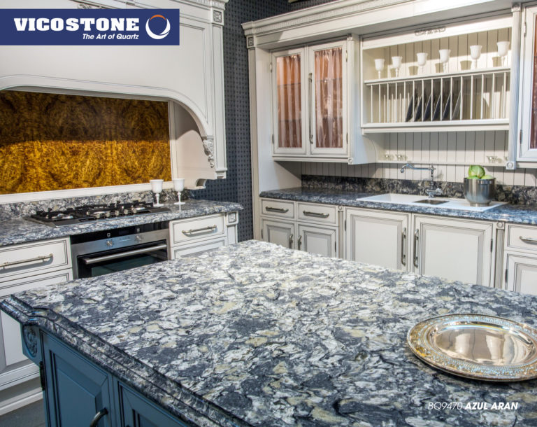 Azul Aran, inspiré du granit naturel, ce quartz possède une beauté sauvage. Avec ses nuances de différentes couleurs , il nous donne un effet de profondeur incomparable.