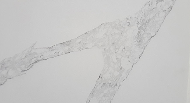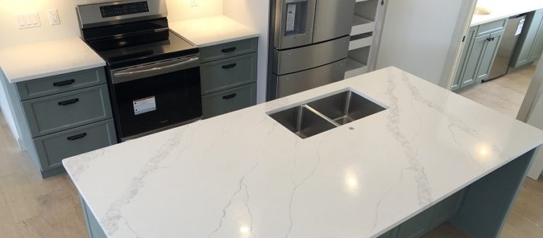 Calacatta Leyla est un magnifique quartz haut de gamme aux tons blancs munis de