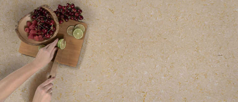 Solare, ce quartz beige est subtilement détaillé de motifs dorés lui donnant un effet de douce profondeur.