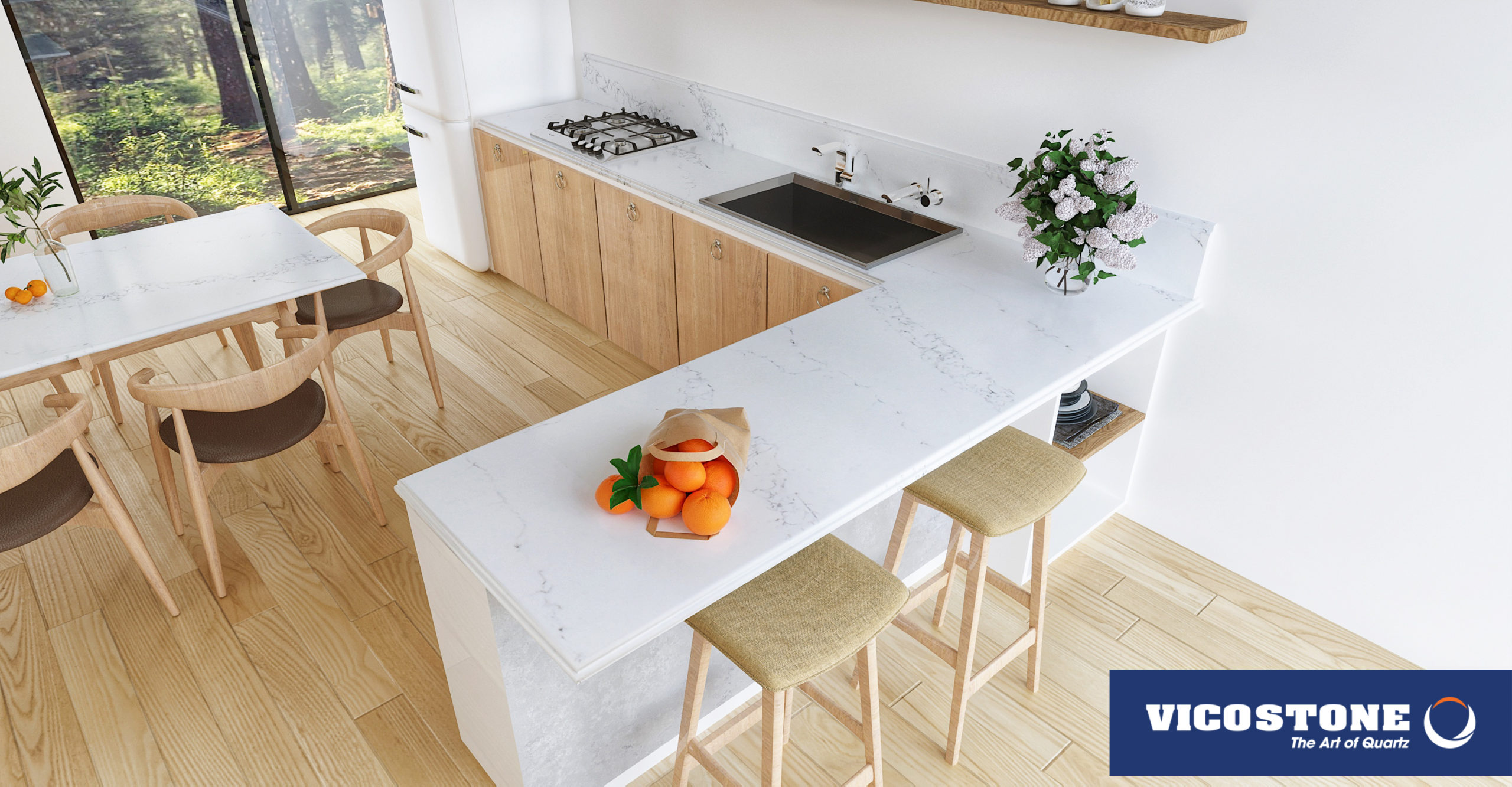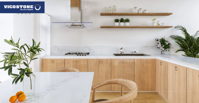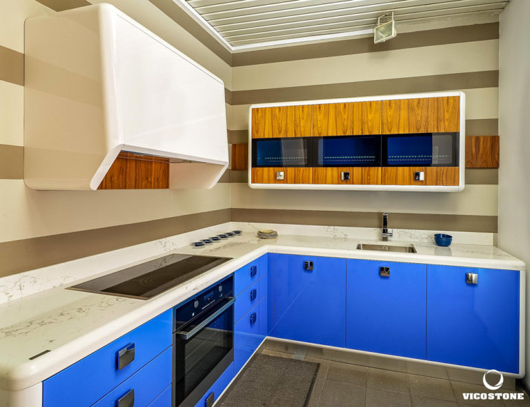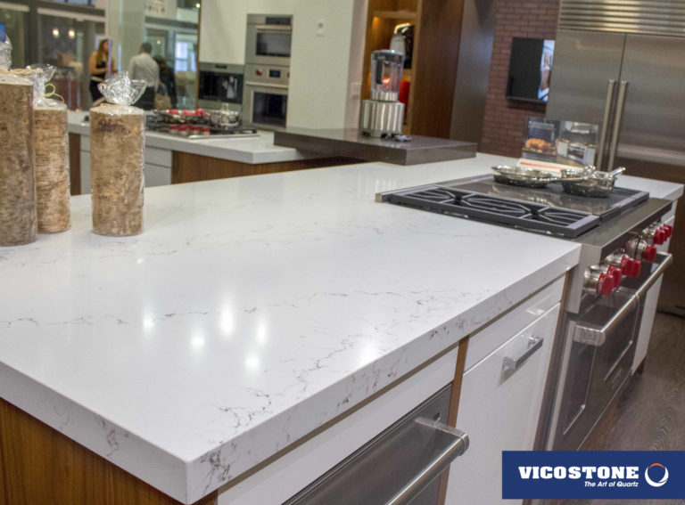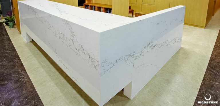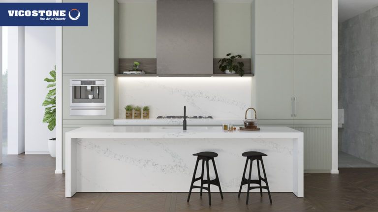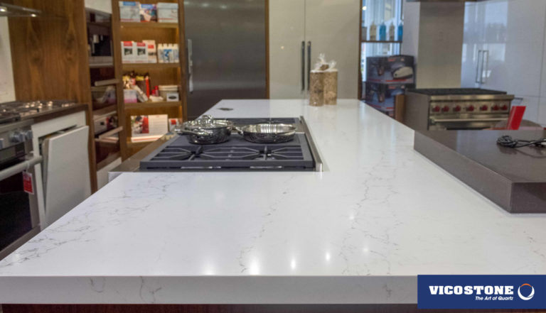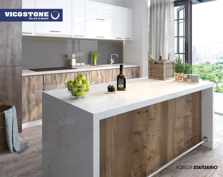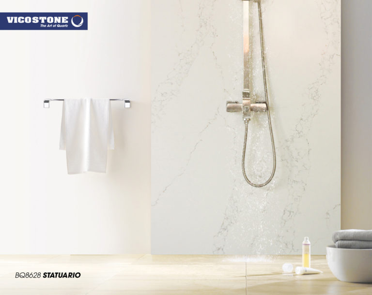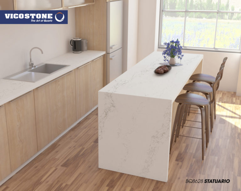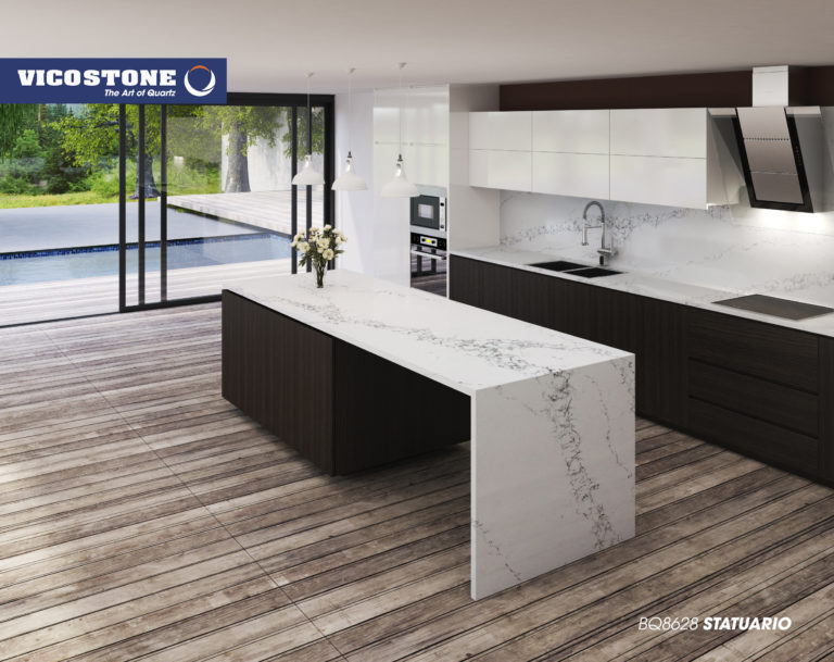 Le Vicostone Statuario simule le parcours des rivières sur un fond de neige blanche