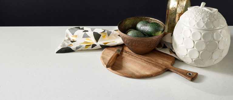 Stellar White, à l’aspect terrazzo, cette couleur possède un fond blanc doux avec des motifs et des éclats tels des bris de verres brillants.