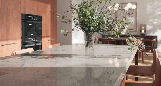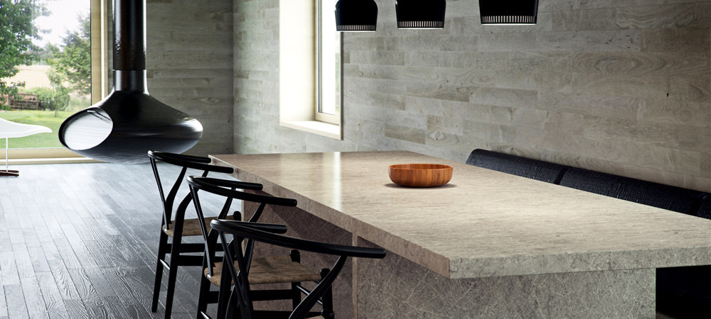 Symphony Grey, ce quartz remplit de tonalités grises claires regorge d’une gamme de lignes blanches au style de hachures qui apporte une magnifique luminosité.