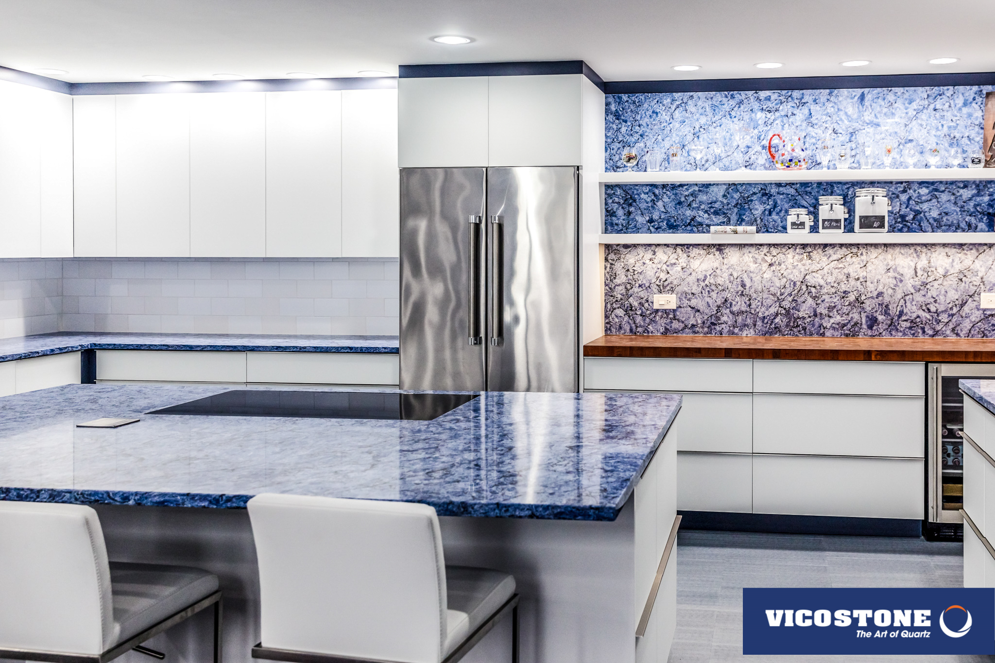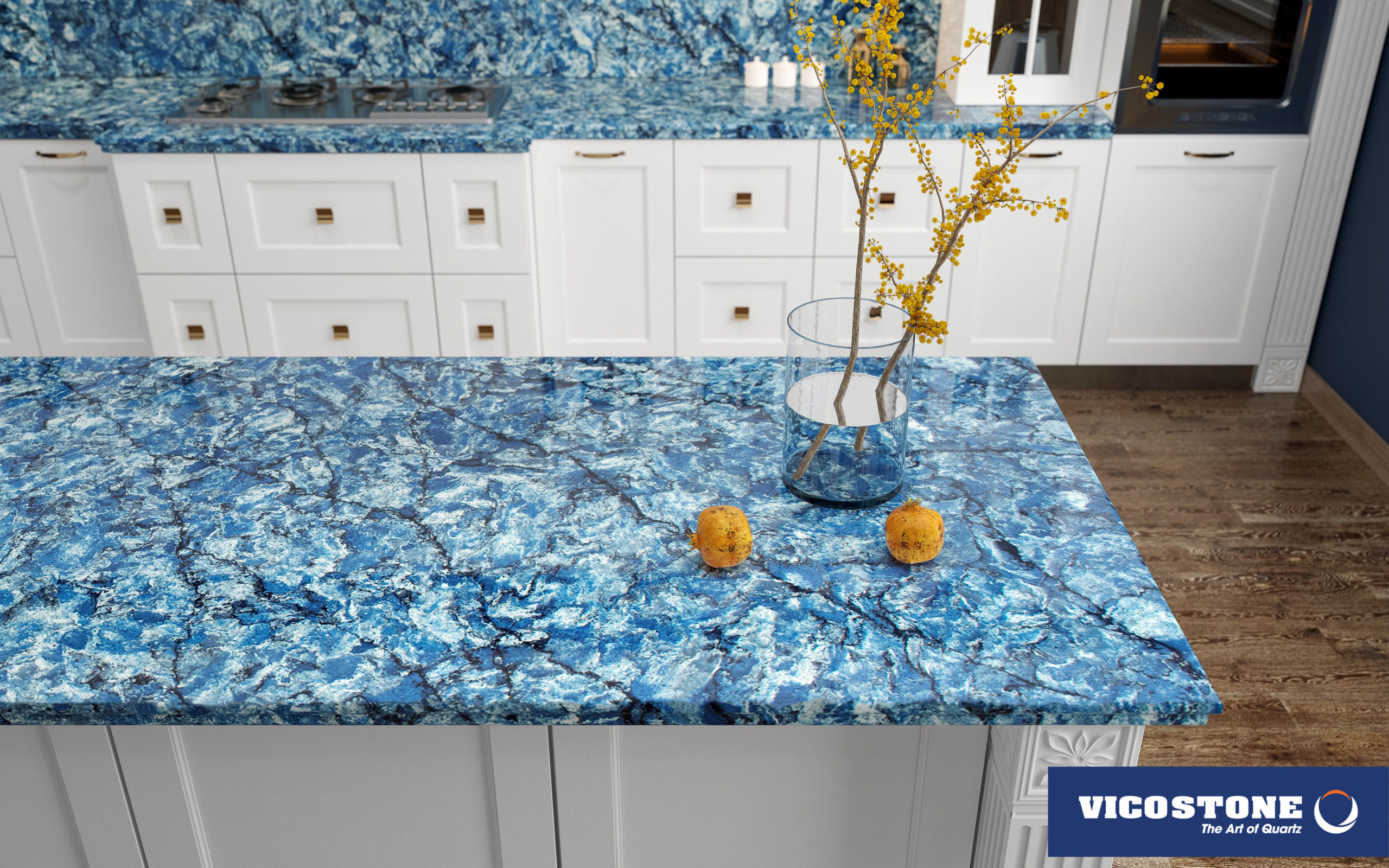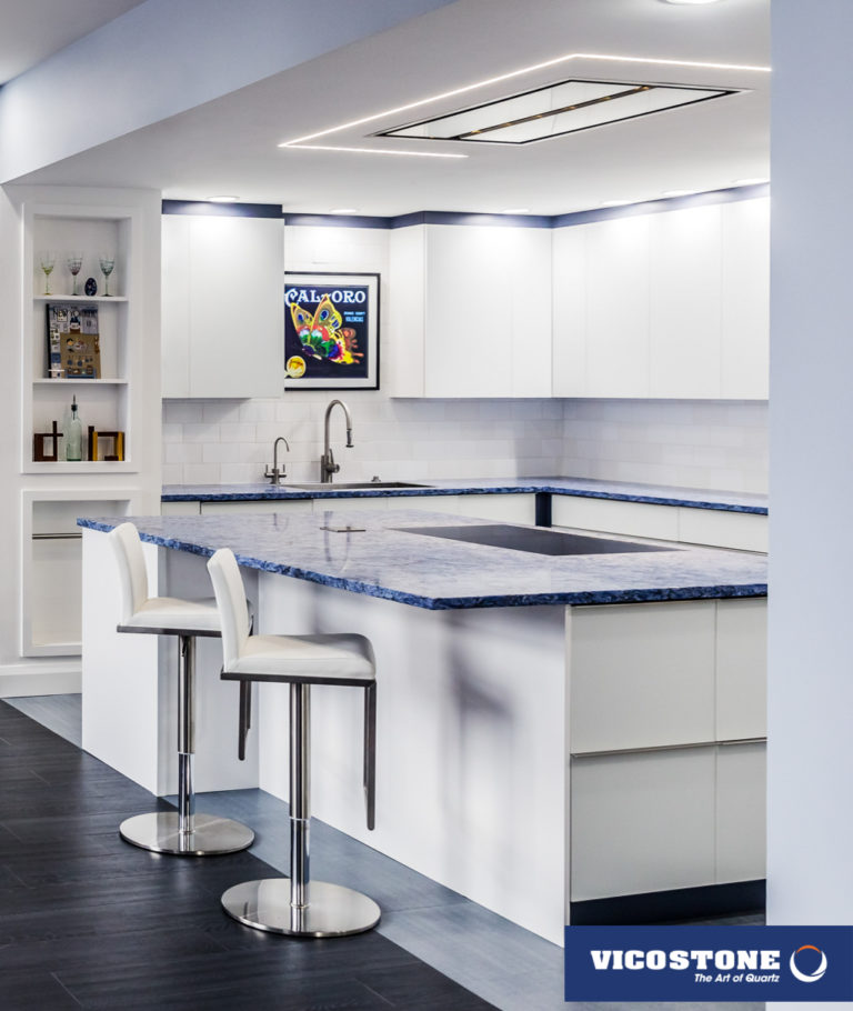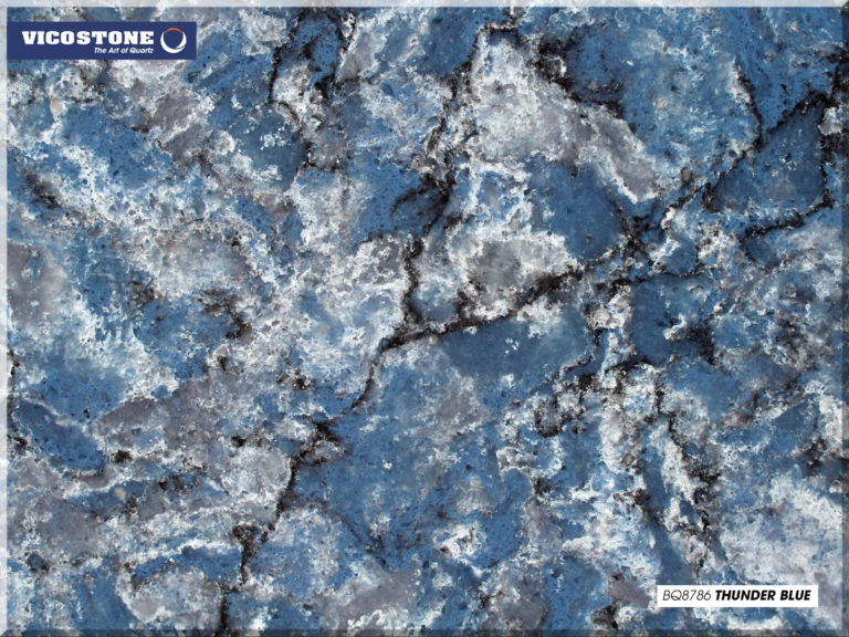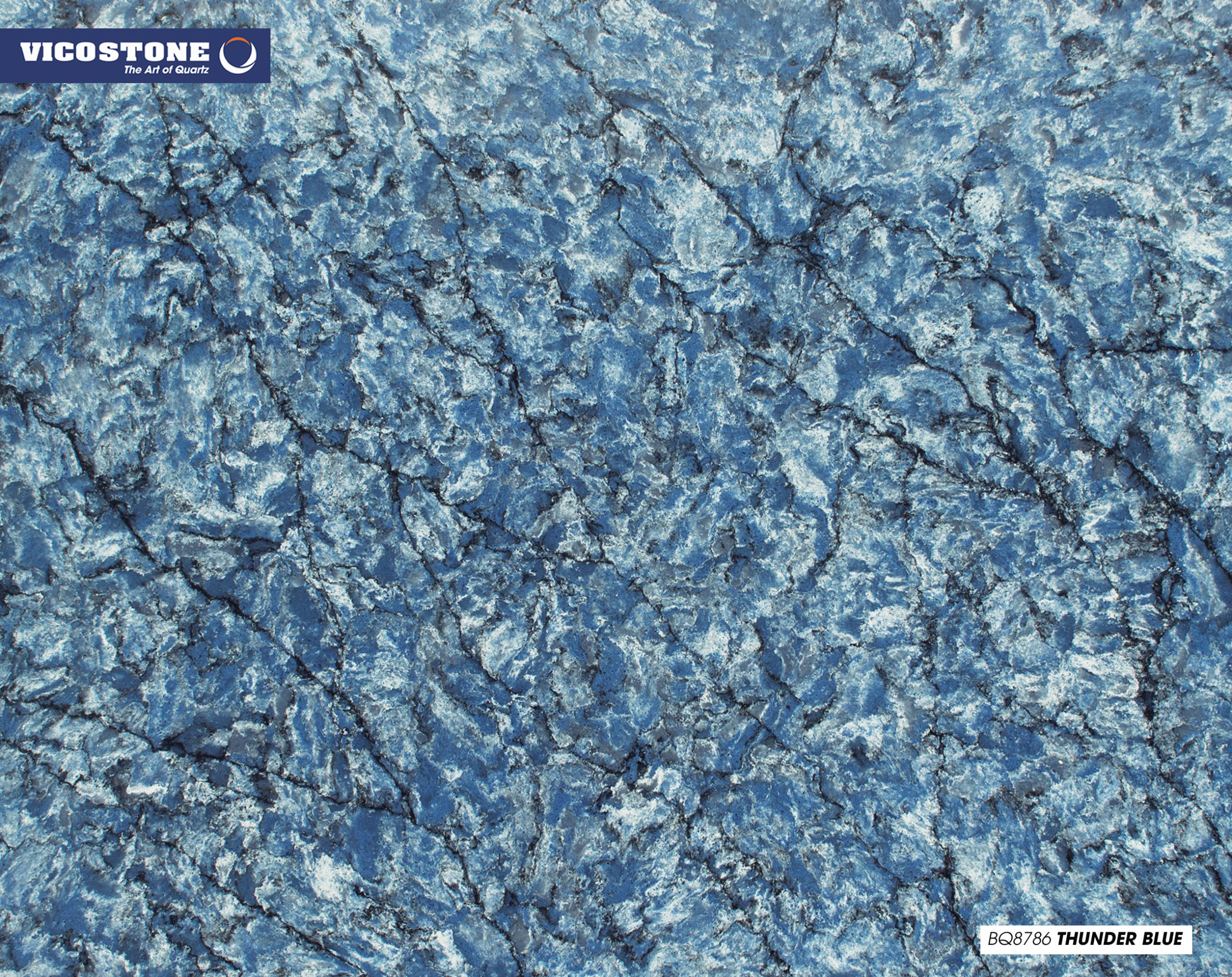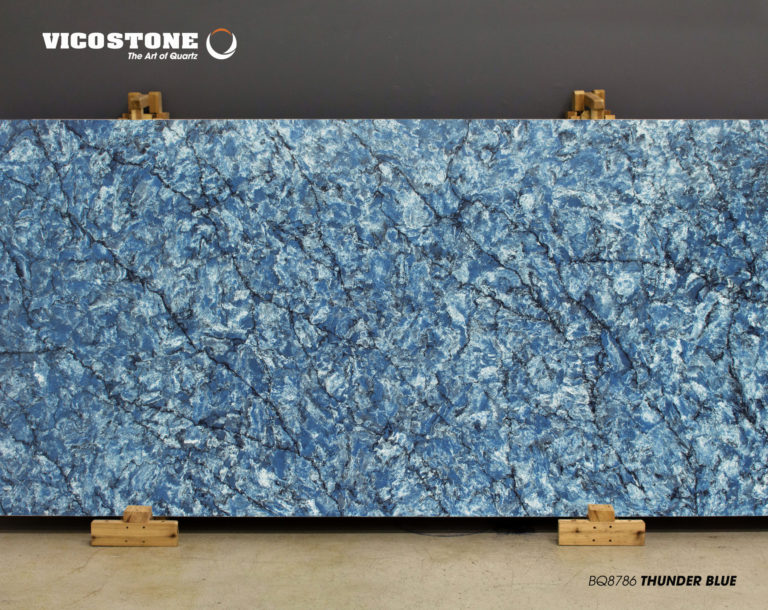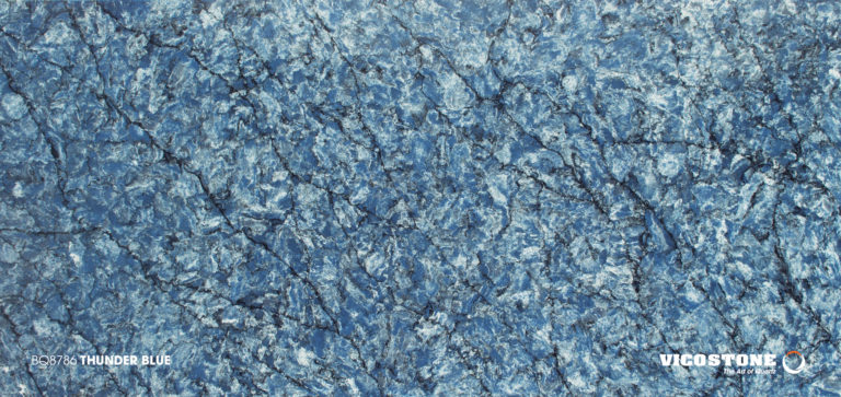 Les surfaces de la gamme Thunder Blue VICOSTONE se distingue par des veines fissurées, semblables à la foudre. Elles deviennent encore plus marquantes sur un fond d’aspect granite bleu marin.
