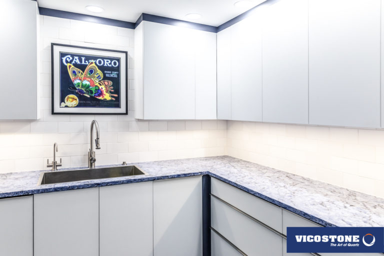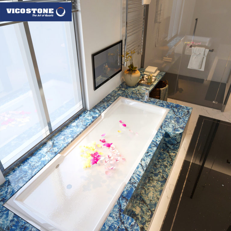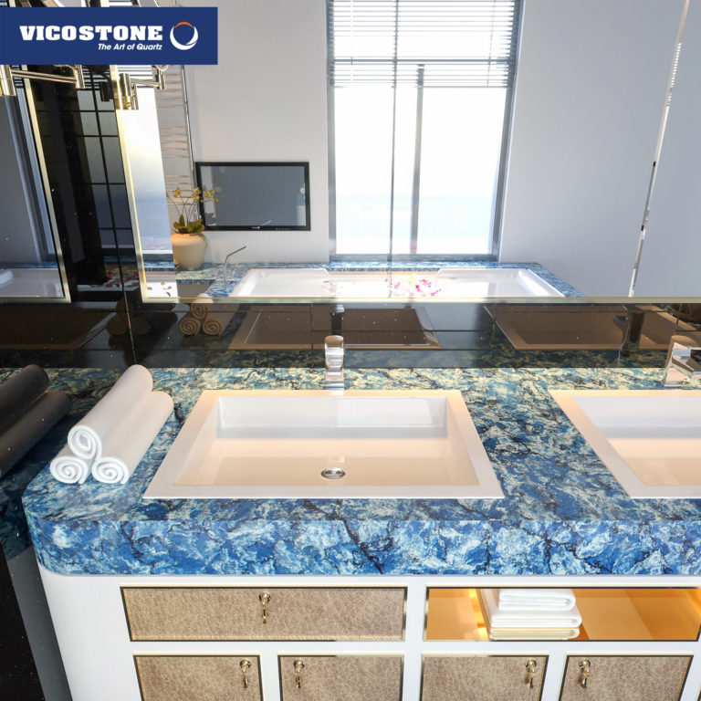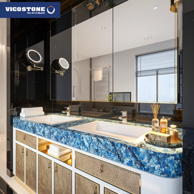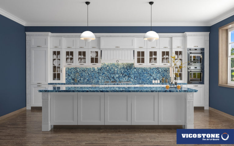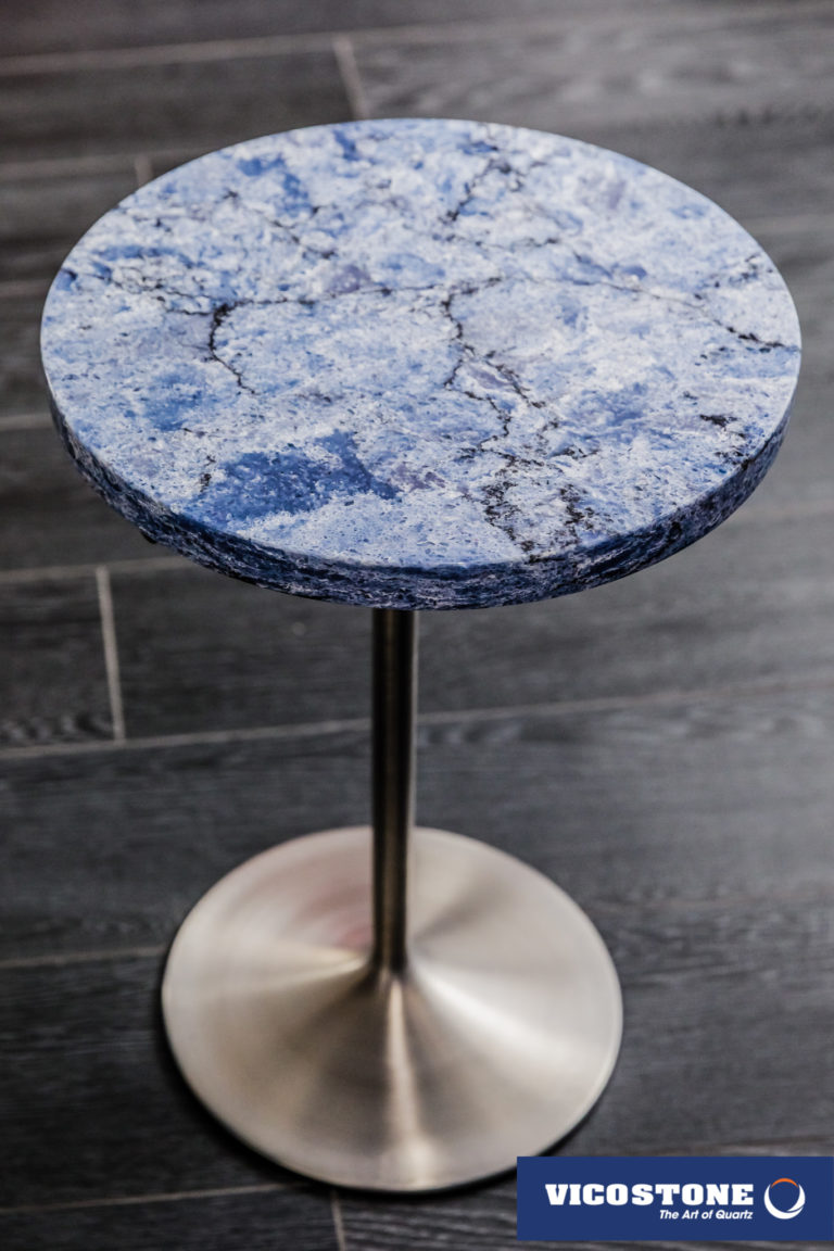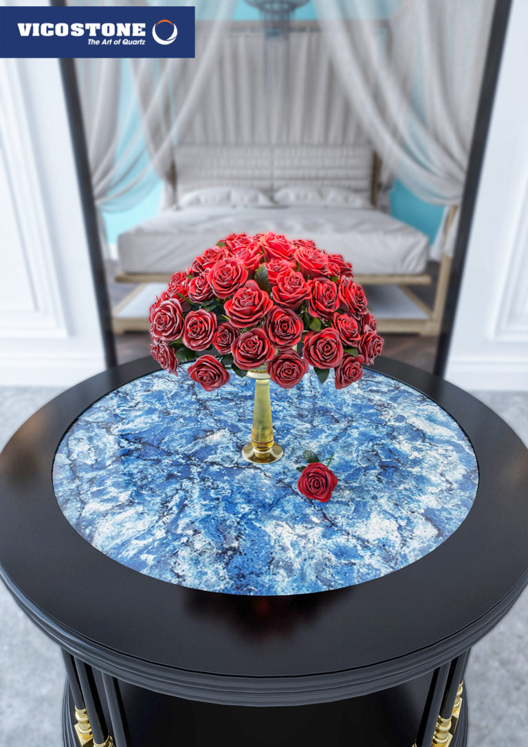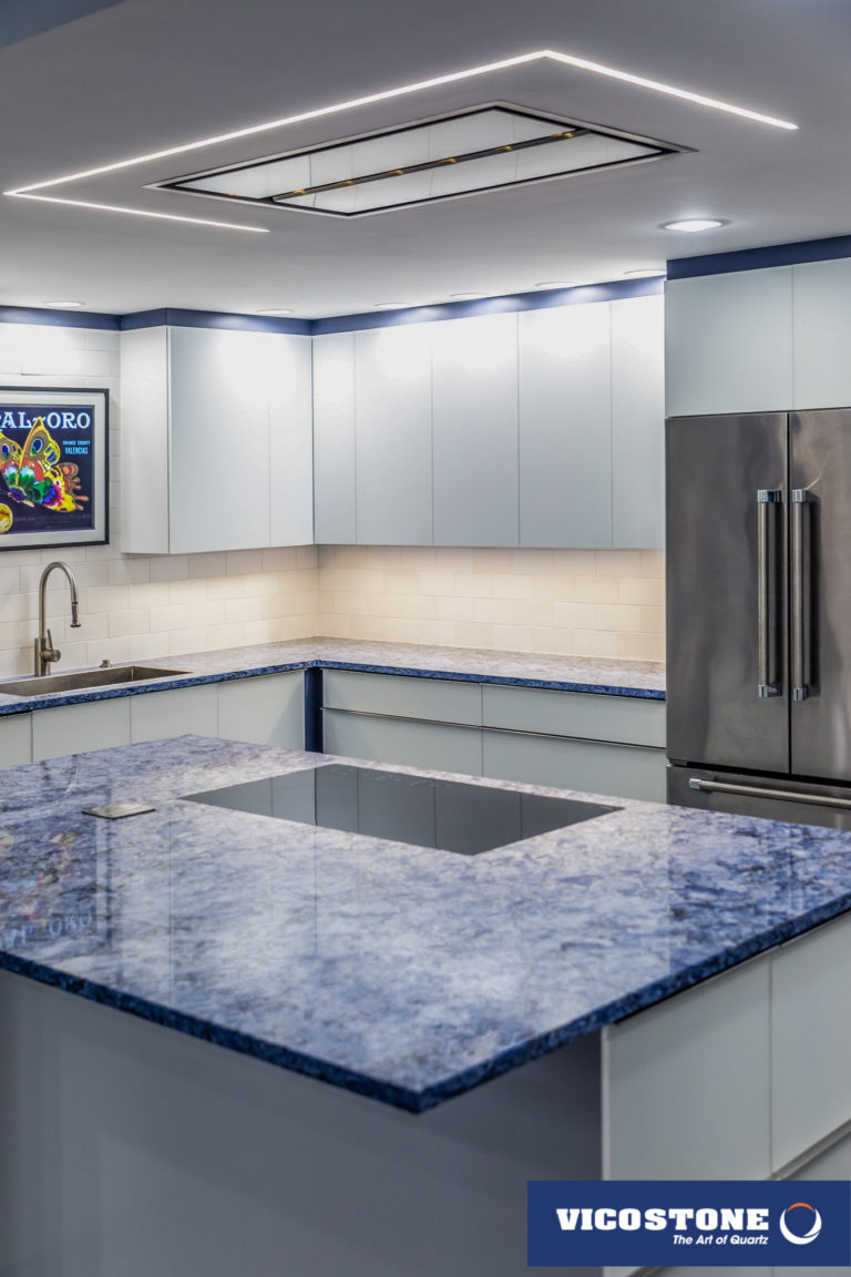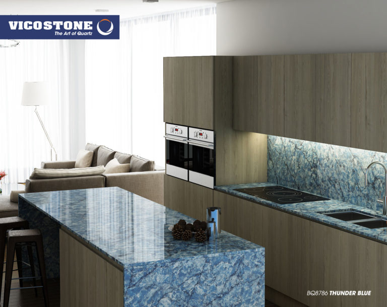 Les surfaces de la gamme Thunder Blue VICOSTONE se distingue par des veines fissurées, semblables à la foudre. Elles deviennent encore plus marquantes sur un fond d’aspect granite bleu marin.