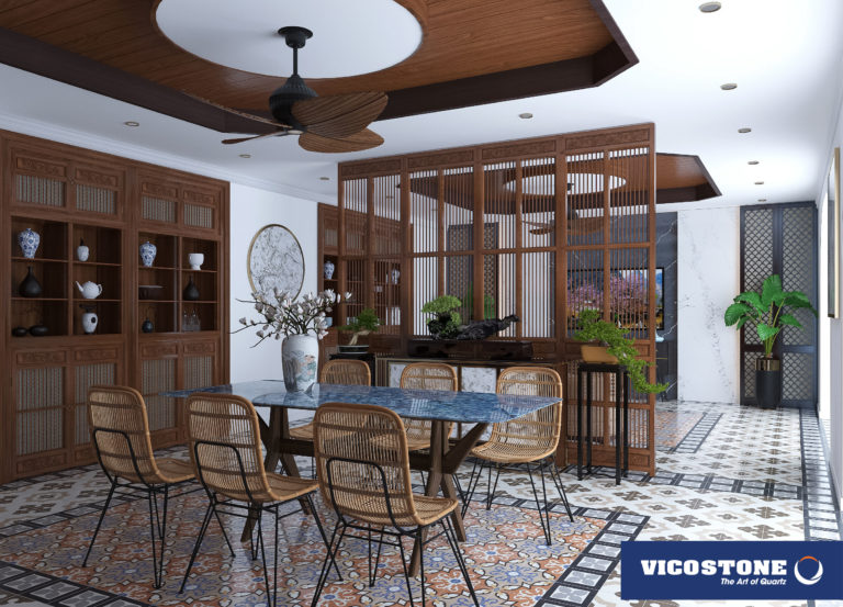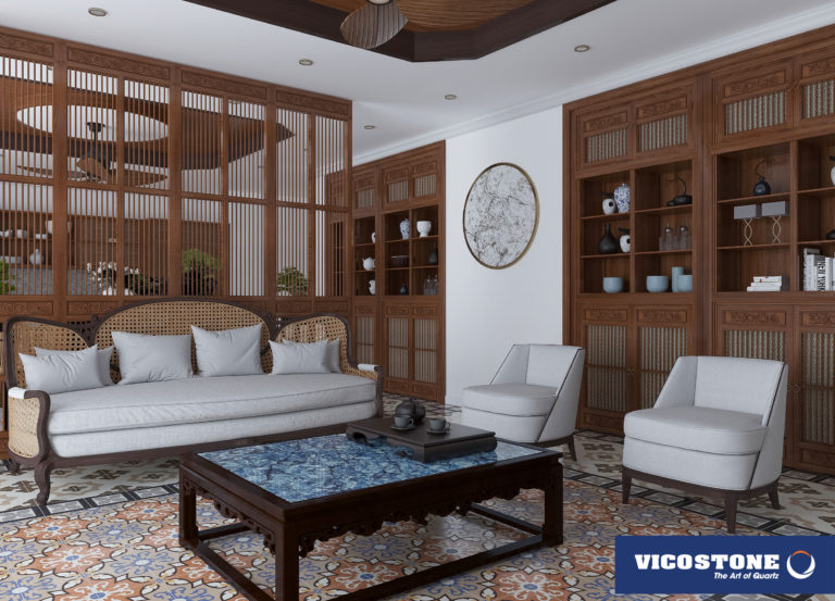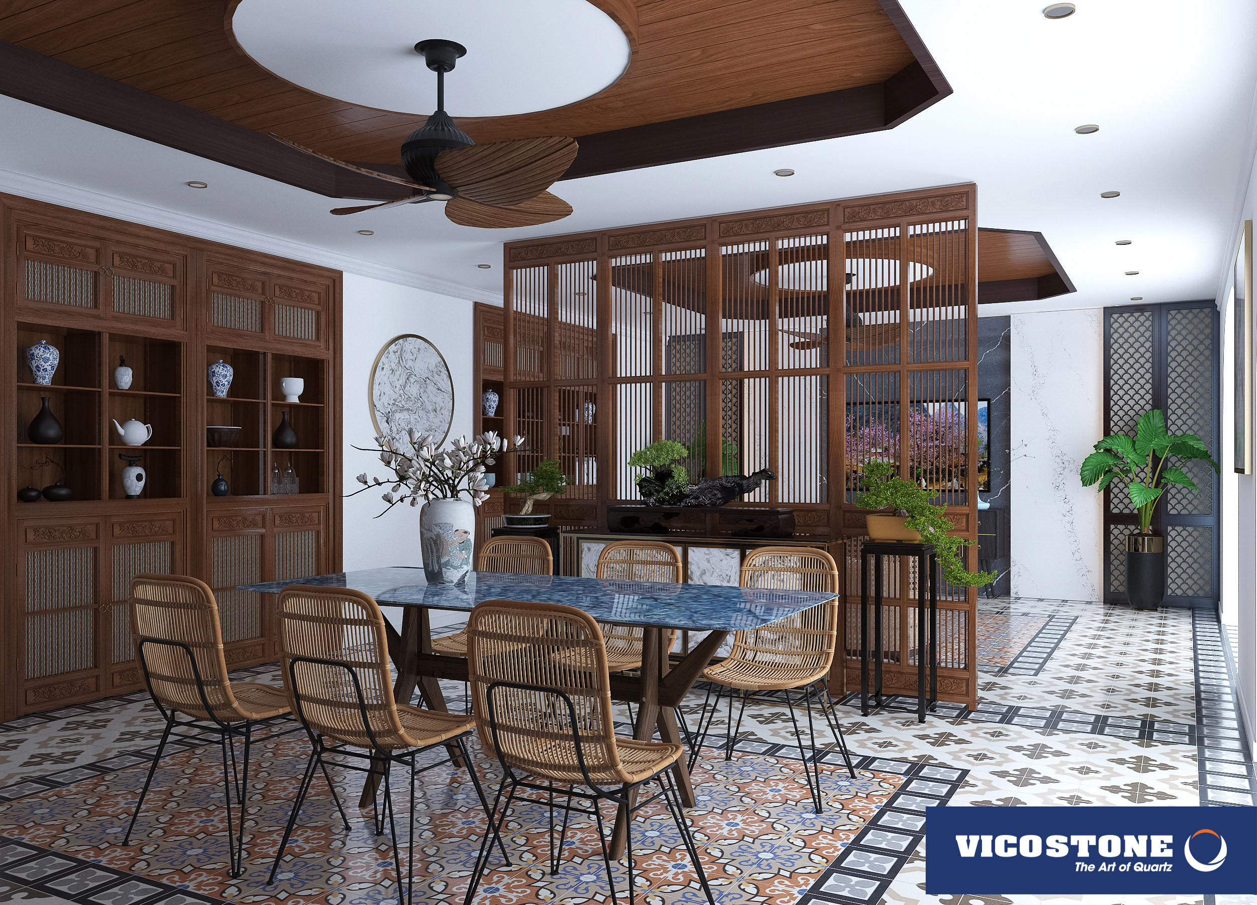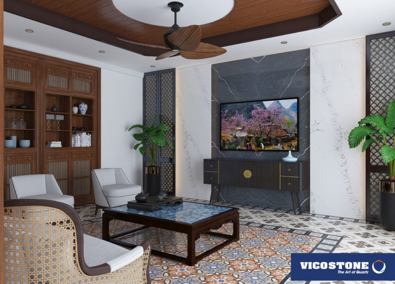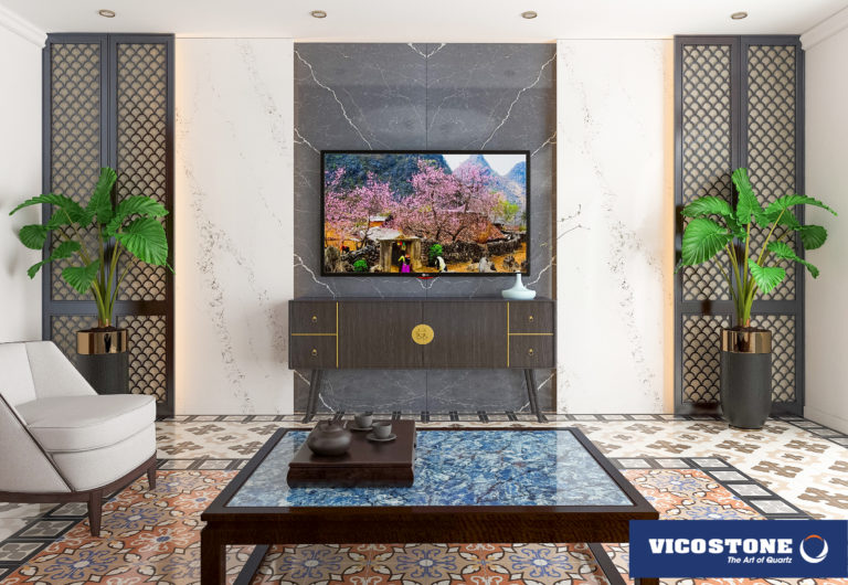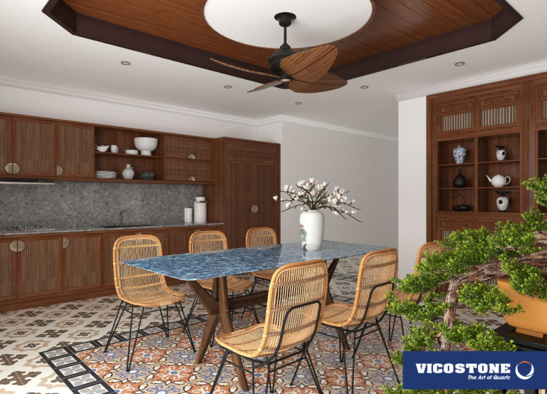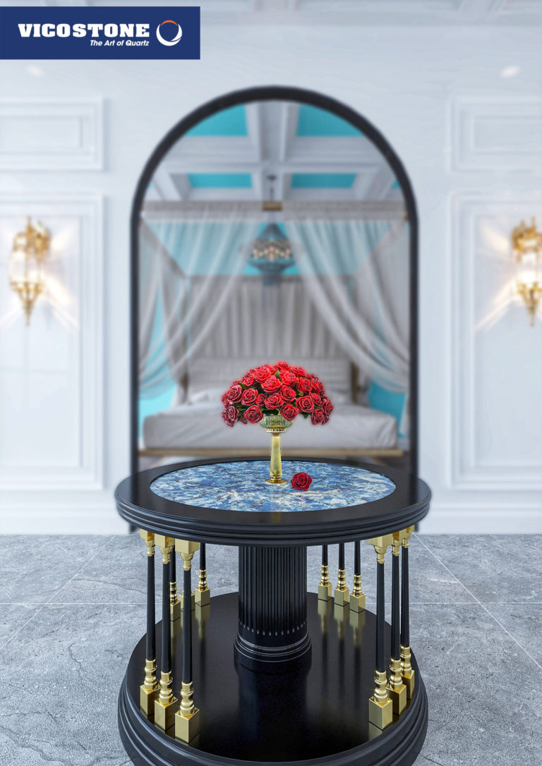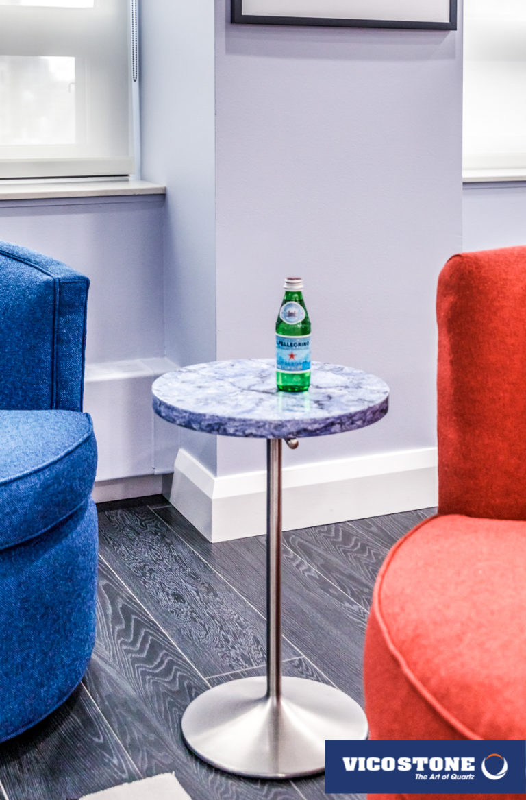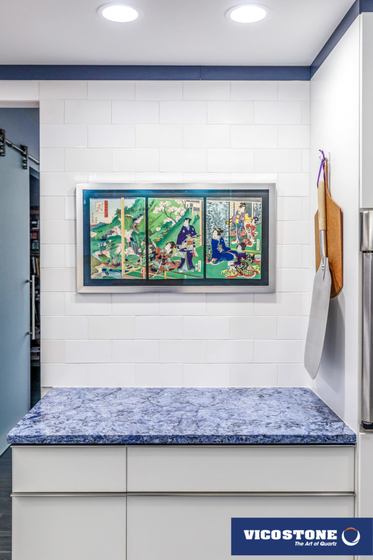 Les surfaces de la gamme Thunder Blue VICOSTONE se distingue par des veines fissurées, semblables à la foudre. Elles deviennent encore plus marquantes sur un fond d’aspect granite bleu marin.